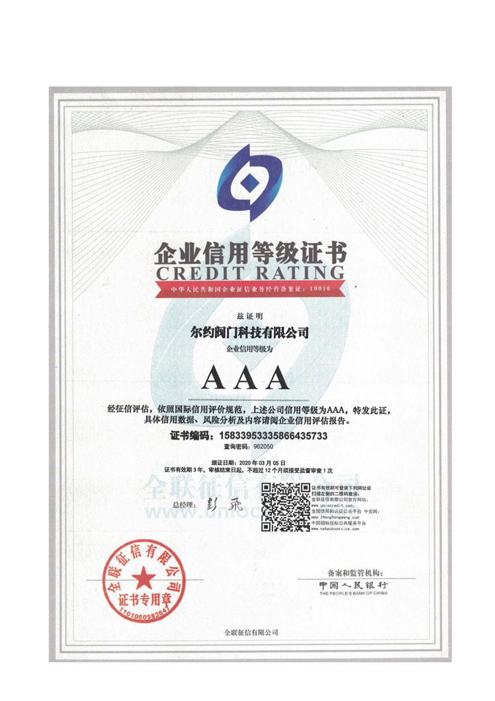 企業信用等級AAA級證書