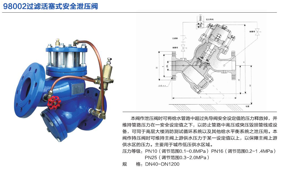 本閥作泄壓閥時可將給水管路中超過先導閥安全設定值的壓力釋放掉,并維持管路壓力在一安全設定值之下,以防止管路中高壓或突壓毀損管線或設備,可同于高層大樓消防測試循環系統以及其他平衡系統之泄壓用。