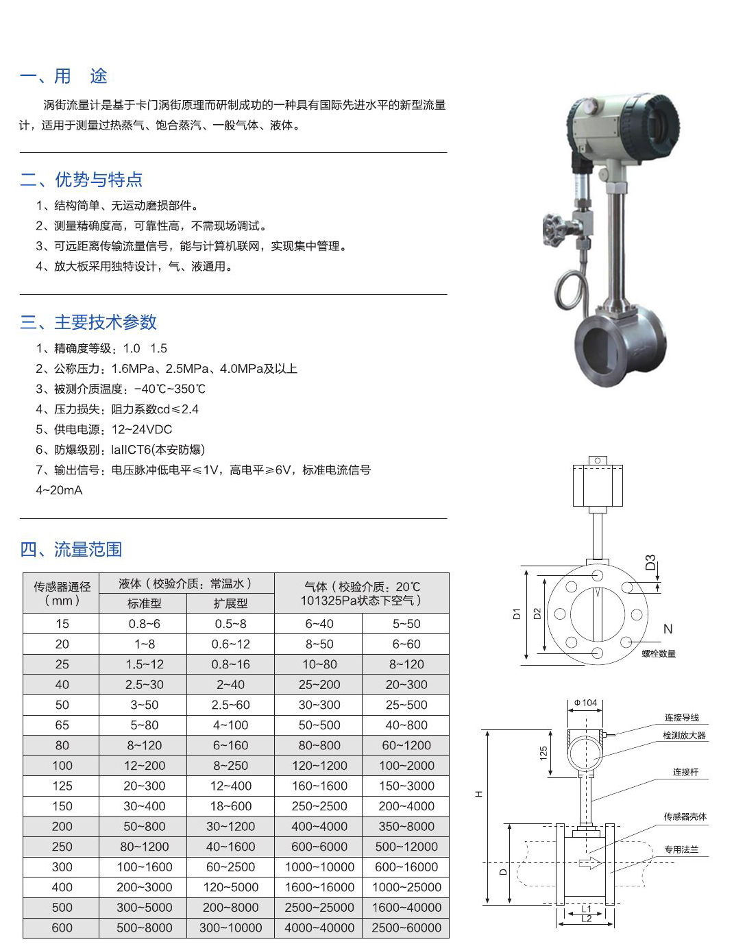 渦街流量計是基于卡門渦街原理而研制成功的一種具有國際先進(jìn)水平的新型流量計,適用于測量過熱蒸氣、飽合蒸汽、一般氣體、液體。