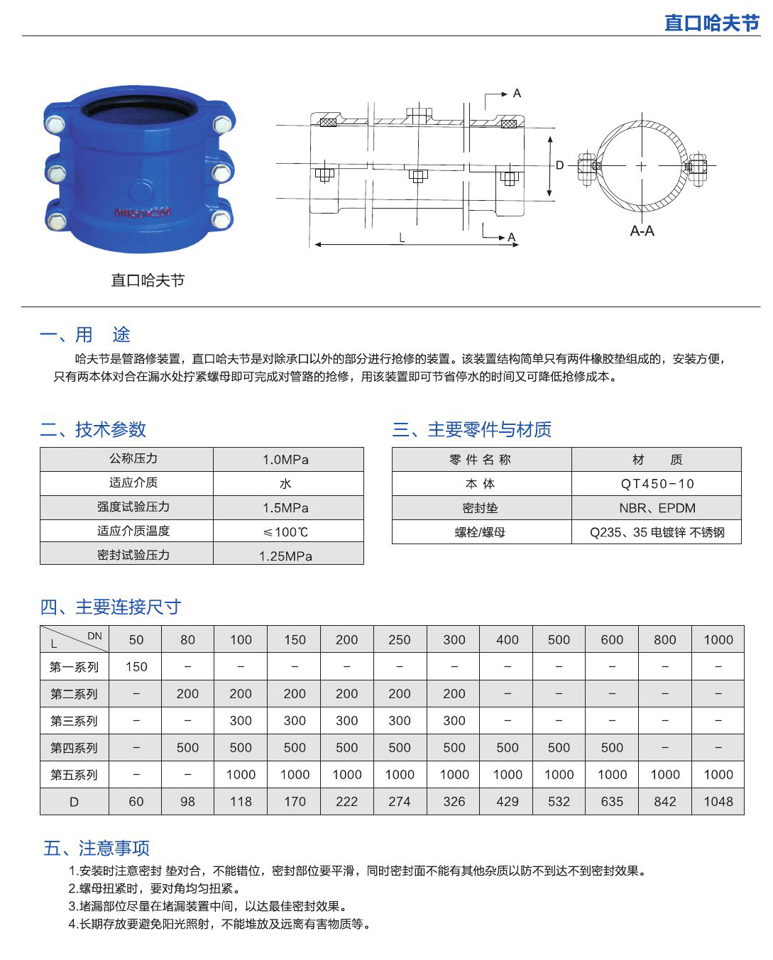 哈夫節是管路搶修裝置,直口哈夫節是對除承口以外的部分進行搶修的裝置,該裝置結構簡單只有兩件橡膠墊組成的,安裝方便,只有兩本體對合在漏水處擰緊螺母即可完成對管路的搶修,用該裝置即可節停水的時間又可降低搶修成本。